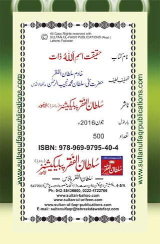 The book ” Haqeeqat e Ism e Allah Zaat ” explains about Reality and Spiritual benefits of Personal Name of Allah which is Also called Ism e Azam.This book is written by Sultan-ul-Ashiqeen Khadim Sultan ul Faqr Hazrat Sakhi Sultan Mohammad Najib ur Rehman Sarwari Qadri . Address: Sultan-ul-Faqr House,Tehreek Dawat e Faqr,4-5/A Extention Education Town Wahdat Road Lahore,Pakistan Phone:+9242 35436600 +923454699975 (Available on Whatsapp, Viber and IMO ) +923324809539 (Available on Whatsapp) www.sultan-bahoo.com www.sultan-ul-arifeen.com www.sultanulfaqrpublications.com www.sultanulfaqr.com www.tehreekdawatefaqr.com
