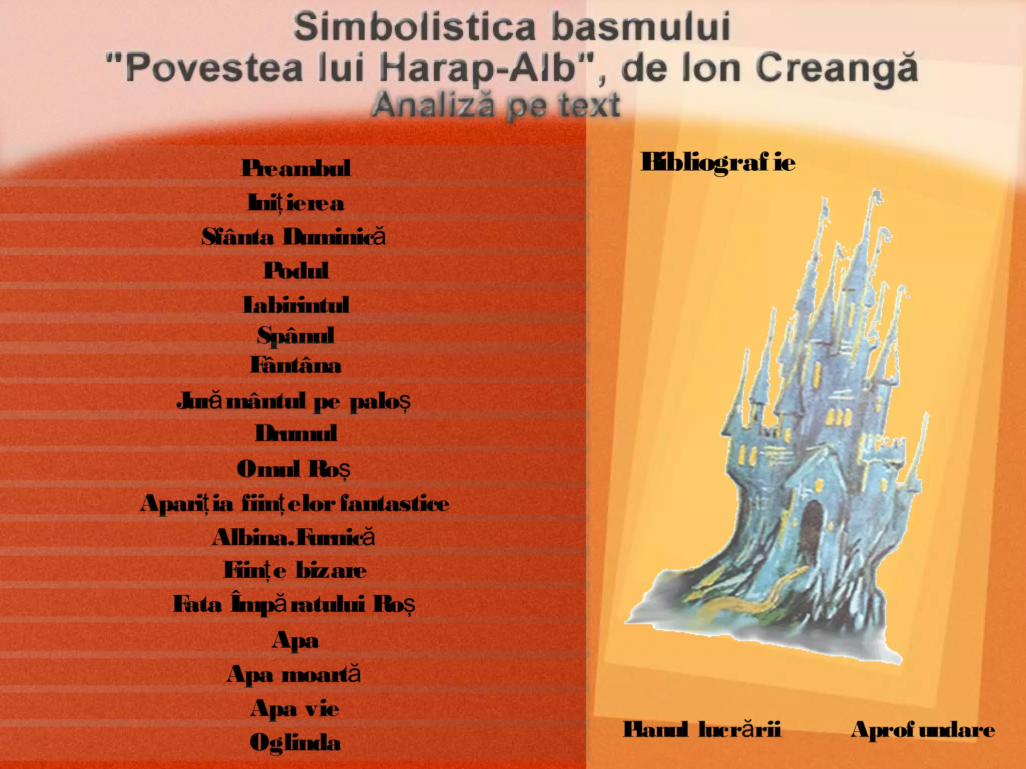 Documentul analizează simbolismul din basmul 'Povestea lui Harap-Alb' de Ion Creangă, descriind călătoria inițiatică a eroului și confruntările sale cu răul, personificate prin personaje ca spânul. Se subliniază importanța probelor și a sprijinului spiritual în procesul de inițiere, precum și tema dualității și a luptei dintre bine și rău. Labirintul și obiecțiile întâlnite simbolizează atât obstacolele interioare ale eroului, cât și drumul către maturizare și auto-descoperire.