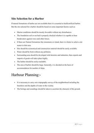 A harbor is a partially enclosed body of water where ships can shelter from winds and waves. Harbors can be natural formations or artificially constructed. The key requirements for a harbor include sufficient depth for ships, anchorage space, protection from waves, access to road/rail, and facilities for loading/unloading cargo. Harbors are classified based on the type of protection (natural, semi-natural, artificial), location (sea, river, lake), and purpose (refuge, commercial, fishery, military). Artificial harbors require constructed breakwaters for protection since they lack natural barriers. Components of an artificial harbor include approach channels, berthing basins, turning basins, quays, breakwaters,