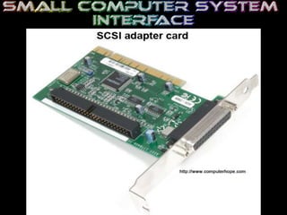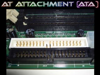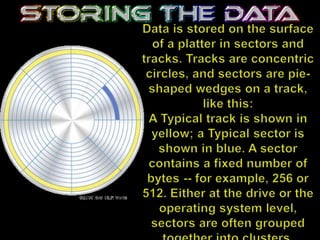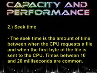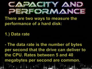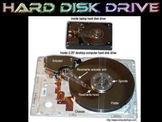 The hard drive is the computer's main storage device that permanently stores all data. It uses rapidly rotating disks coated with magnetic material to store and retrieve digital information electromagnetically. A hard drive consists of stacked disks with data recorded in concentric circles, read and written by heads on each side of the disks as they spin. Hard drive performance is measured by data rate and seek time. Common interfaces include ATA, SATA, and SCSI.