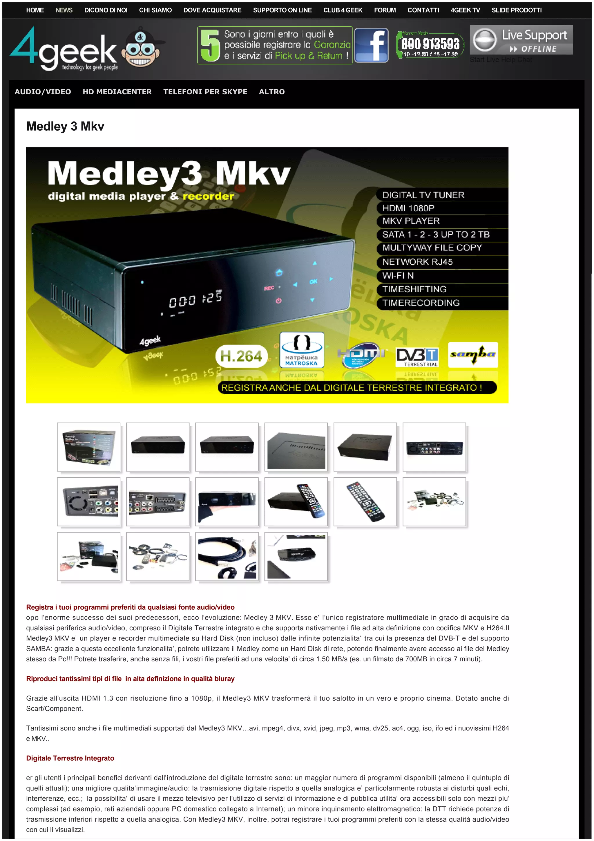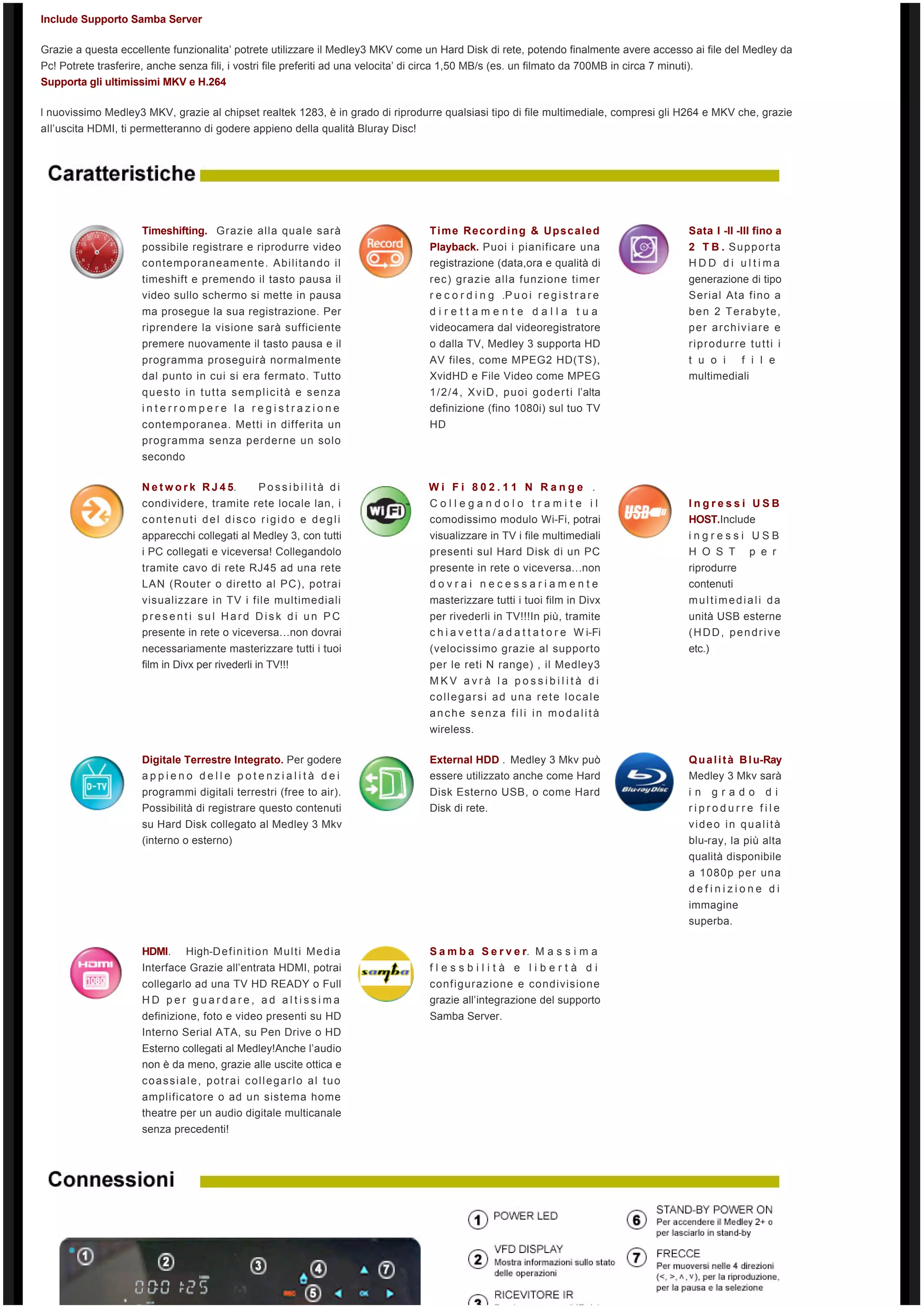 Il Medley 3 MKV è un registratore multimediale versatile in grado di acquisire segnali da varie fonti e supporta file audio/video in alta definizione, inclusi formati MKV e H.264. Offre capacità di registrazione, un'interfaccia Samba per l'accesso ai file da PC, e un'uscita HDMI per trasmettere video in qualità Blu-ray. Il dispositivo è ben accolto per le sue funzionalità, anche se alcuni utenti segnalano la necessità di aggiornamenti firmware per ottimizzarne le prestazioni.