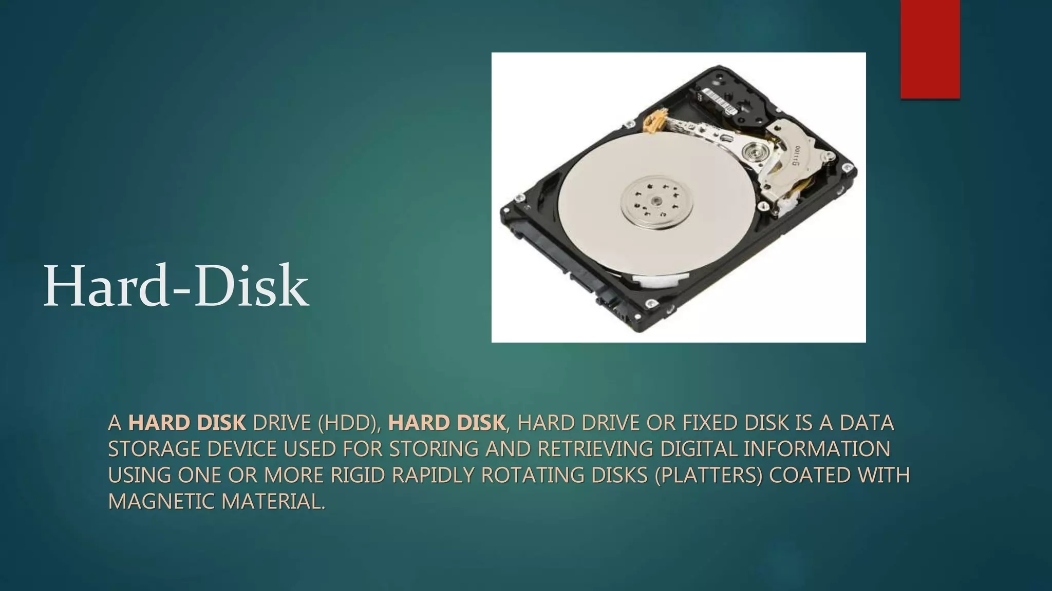 A hard disk drive (HDD) is a data storage device that uses rigid, rotating disks coated with magnetic material to store and retrieve digital information. Introduced by IBM in 1956, HDDs became the primary storage for computers, evolving in capacity and technology over the decades. While they offer advantages like long-term data storage and large capacity, HDDs also have downsides such as susceptibility to failure and size compared to other storage options.