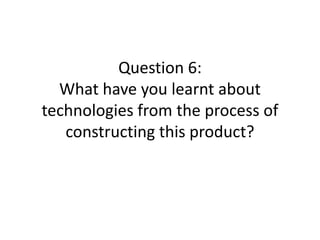 The document discusses various hardware, software, and technologies the respondent used to construct their product. They learned how to better use a Canon digital camera's aperture feature to control lighting. They learned keyboard shortcuts and file management using Apple Macs. Photoshop, InDesign, and other design software helped edit images and compose the magazine. Prezi, Blogger, and other programs aided in presentations and documentation of the process. Various technologies like studio lights, scanners, and memory cards supported capturing and working with images and files. The respondent gained experience with different features and applications of the technologies.