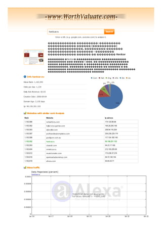 Документ предоставляет информацию об аналитике веб-сайта hardcar.ru, включая данные о трафике, доходах от рекламы и возраст домена. Также сопоставляются ранги сайтов с аналогичными показателями и содержится информация о IP-адресах. В заключение, документ включает технические детали хостинга и DNS конфигурации сайта.