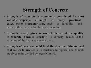 The document discusses factors that affect the strength of concrete, including water-cement ratio, aggregate-cement ratio, maximum aggregate size, and degree of compaction. It states that concrete strength is inversely proportional to water-cement ratio according to Abrams' law. A lower water-cement ratio and higher degree of compaction produce stronger concrete by reducing porosity. A leaner aggregate-cement ratio also increases strength by absorbing water and reducing shrinkage. Larger aggregate size can reduce water needs but may decrease strength by lowering surface area for bond development.