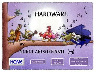 Dokumen ini menjelaskan tentang perangkat keras atau hardware komputer, khususnya fokus pada perangkat input. Terdapat berbagai jenis input device seperti keyboard, mouse, touchpad, dan scanner yang berfungsi untuk memasukkan data ke dalam sistem komputer. Setiap perangkat memiliki spesifikasi dan cara kerja yang berbeda, serta memberikan kemudahan dalam proses pengolahan informasi.