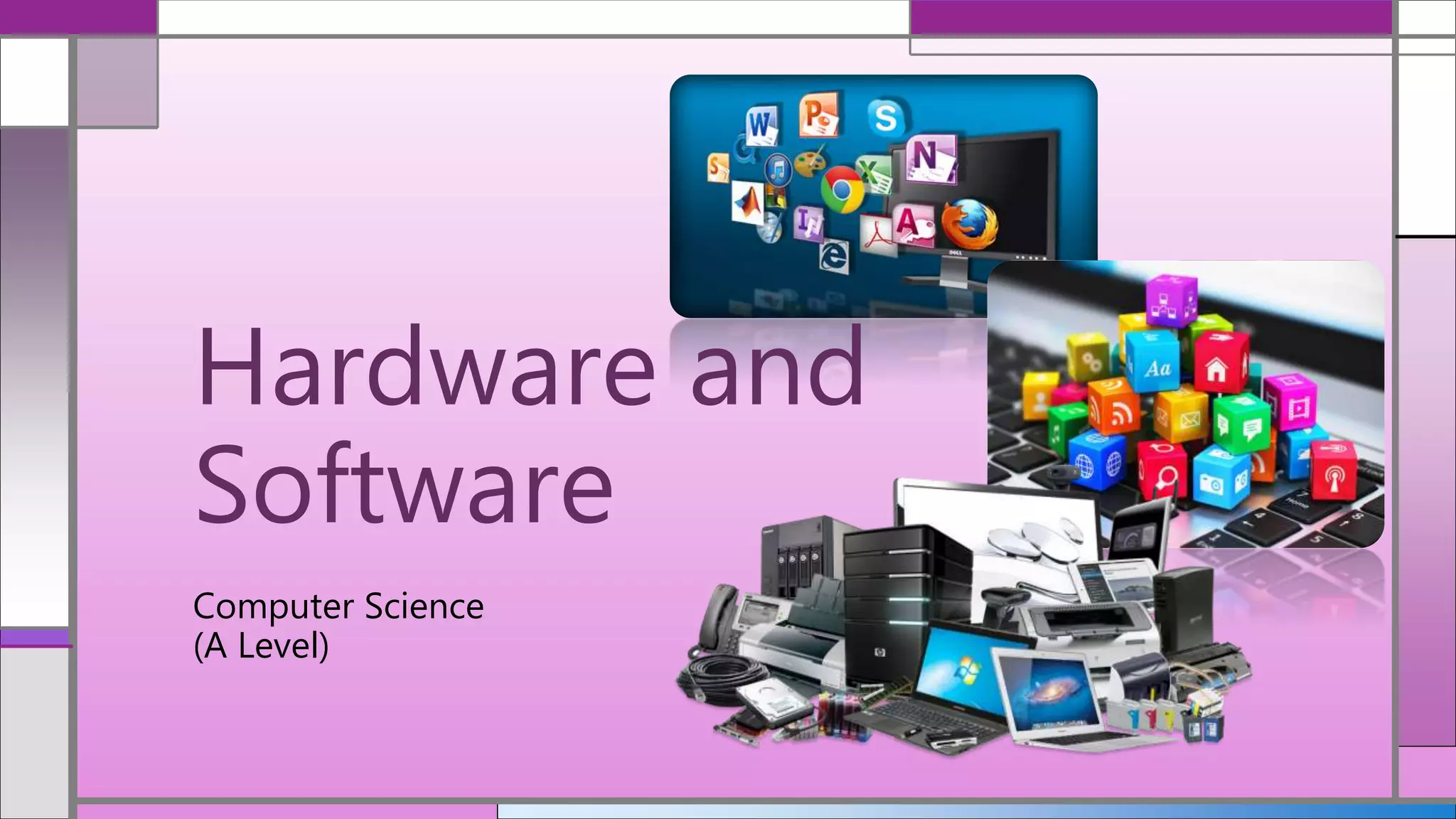 The document outlines the fundamental concepts of computer science at the A level, focusing on hardware and software. It differentiates between external components, known as peripherals (like mouse and keyboard), and internal components (like hard disk and processor). Additionally, it explains the role of software in instructing hardware operations.