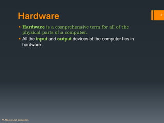 Hardware devices that are used to input and output data to a computer are called I/O devices. Input devices capture information from the external environment and convert it into a format that can be processed by the computer. Examples include keyboards, mice, scanners, microphones, and webcams. Output devices take the processed data from the computer and present it to the user. Common output devices are monitors, printers, speakers and plotters. Monitors display soft copy output while printers provide hard copy printouts.