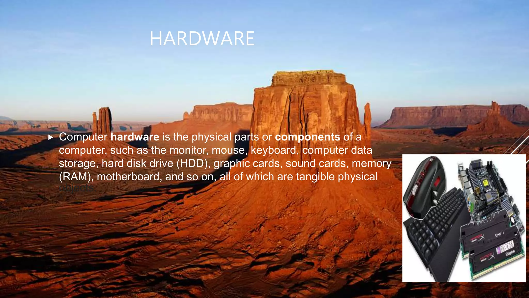 Computer hardware refers to the physical components of a computer including components like the monitor, keyboard, data storage devices, graphic and sound cards, memory, motherboard, and more. These are the tangible physical parts that make up a computer system and allow it to function. The document discusses defining computer hardware and understanding the functions of these various components.