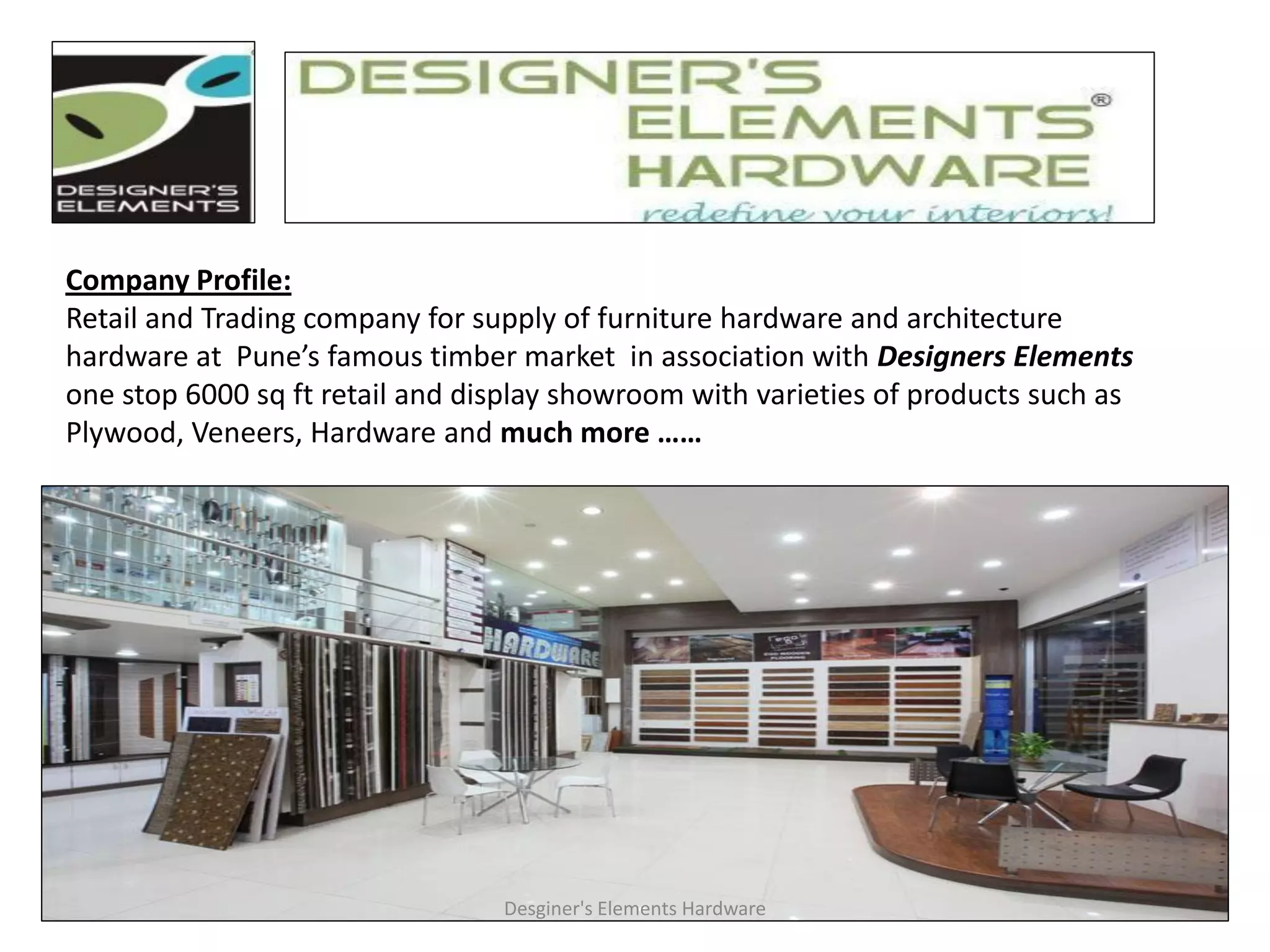 Designer's Elements Hardware is a retail and trading company located in Pune, India that supplies furniture and architecture hardware. They operate a 6000 square foot retail showroom displaying a wide variety of products including plywood, veneers, hardware, and more. Their showroom stocks architectural fittings, designer hardware, bathroom accessories, kitchen solutions, railings, crystal products, furniture fittings, safes, locks, hinges, and many other hardware items.