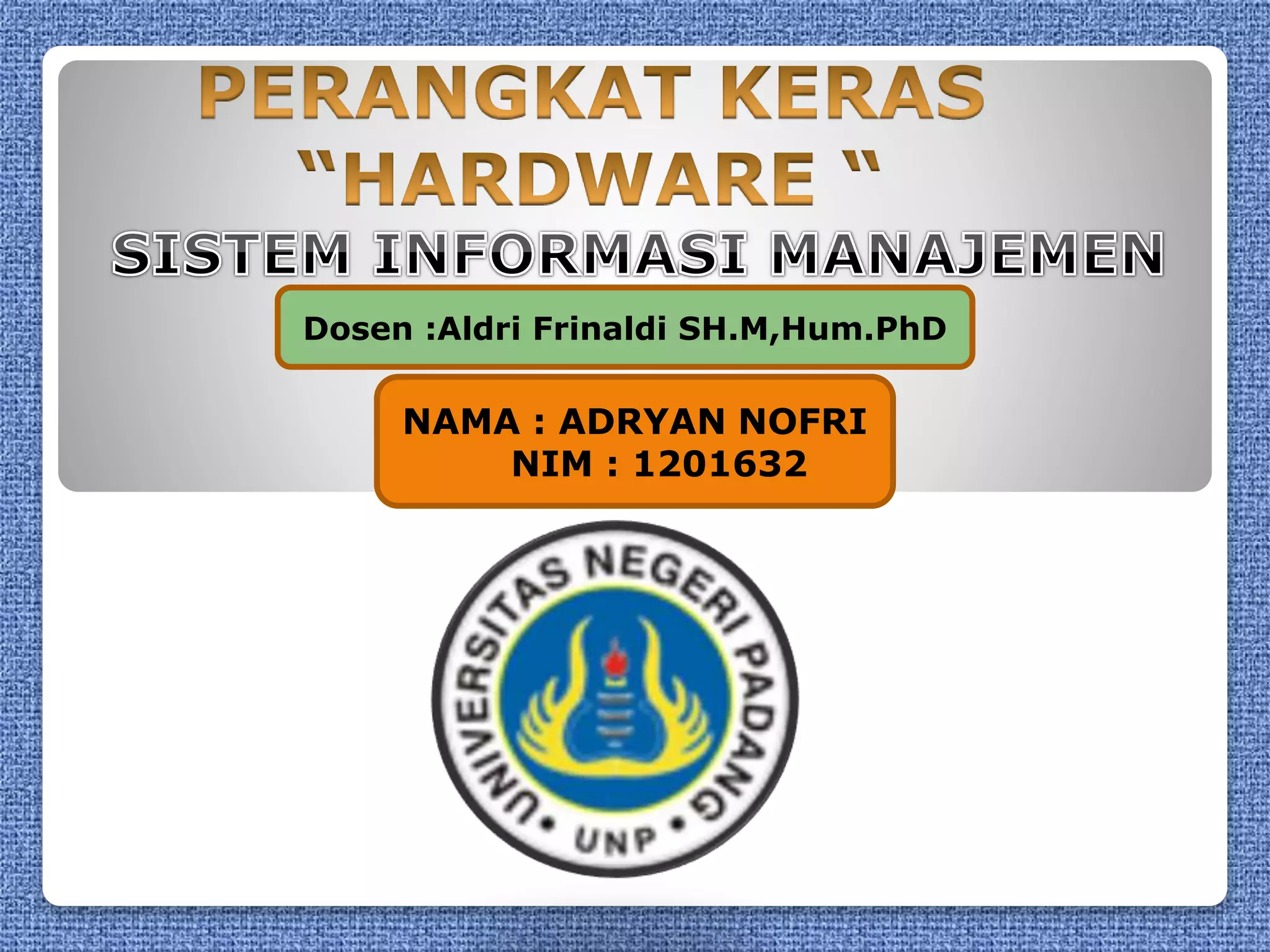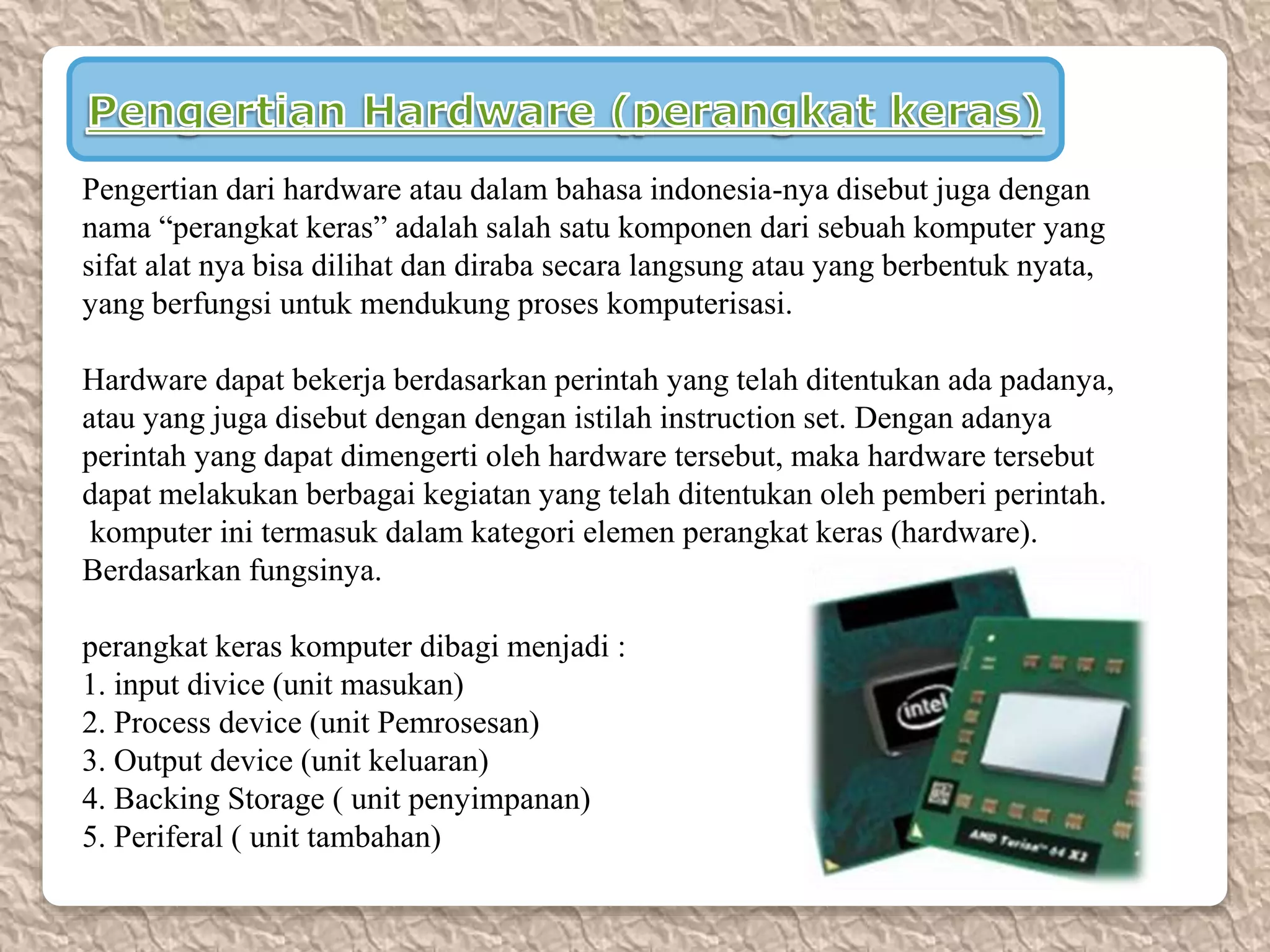 Dokumen tersebut membahas pengertian dan jenis-jenis perangkat keras (hardware) pada komputer. Hardware dibagi menjadi 5 kategori utama yaitu unit masukan, unit pemrosesan, unit keluaran, unit penyimpanan, dan unit tambahan. Masing-masing kategori memiliki perangkat keras pendukungnya seperti keyboard, mouse, processor, memory, monitor, printer, harddisk, modem dan lainnya.