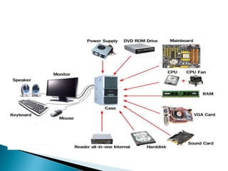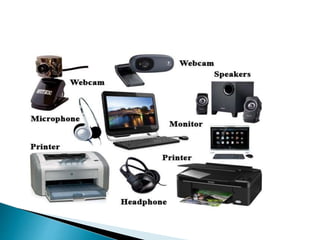 The document discusses computer hardware and software. It defines hardware as the physical and electronic parts of a computer, including the CPU and peripheral devices. The CPU processes data according to instructions and contains an ALU and control unit. Software refers to computer programs and instructions that guide the hardware. There are two main types of software: system software that controls hardware operations, and application software for specific tasks like payroll or word processing. Input and output devices allow interaction between users and the CPU by translating data into forms it can understand. Common input devices include keyboards, mice, scanners, and microphones.