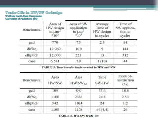 This document discusses hardware/software codesign. It introduces codesign concepts and benefits over traditional design processes. Codesign allows concurrent development of hardware and software to optimize design tradeoffs. The document outlines topics on codesign fundamentals, tradeoffs, past approaches, and future directions like multiprocessor system-on-chip applications. Codesign moves parts between software and hardware to improve performance while meeting design constraints like cost, power, and time-to-market.