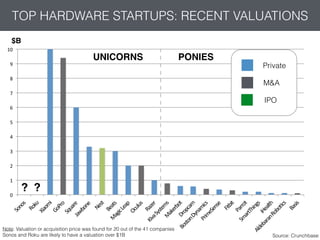 The document provides an overview of hardware startups, highlighting valuations, acquisitions, and VC funding, with a focus on unicorns and crowdfunding. It notes the dominance of U.S. companies and the accelerating pace of mergers and acquisitions in the industry. Key categories identified include AR/VR, lifestyle, wearables, home security, and robotics.