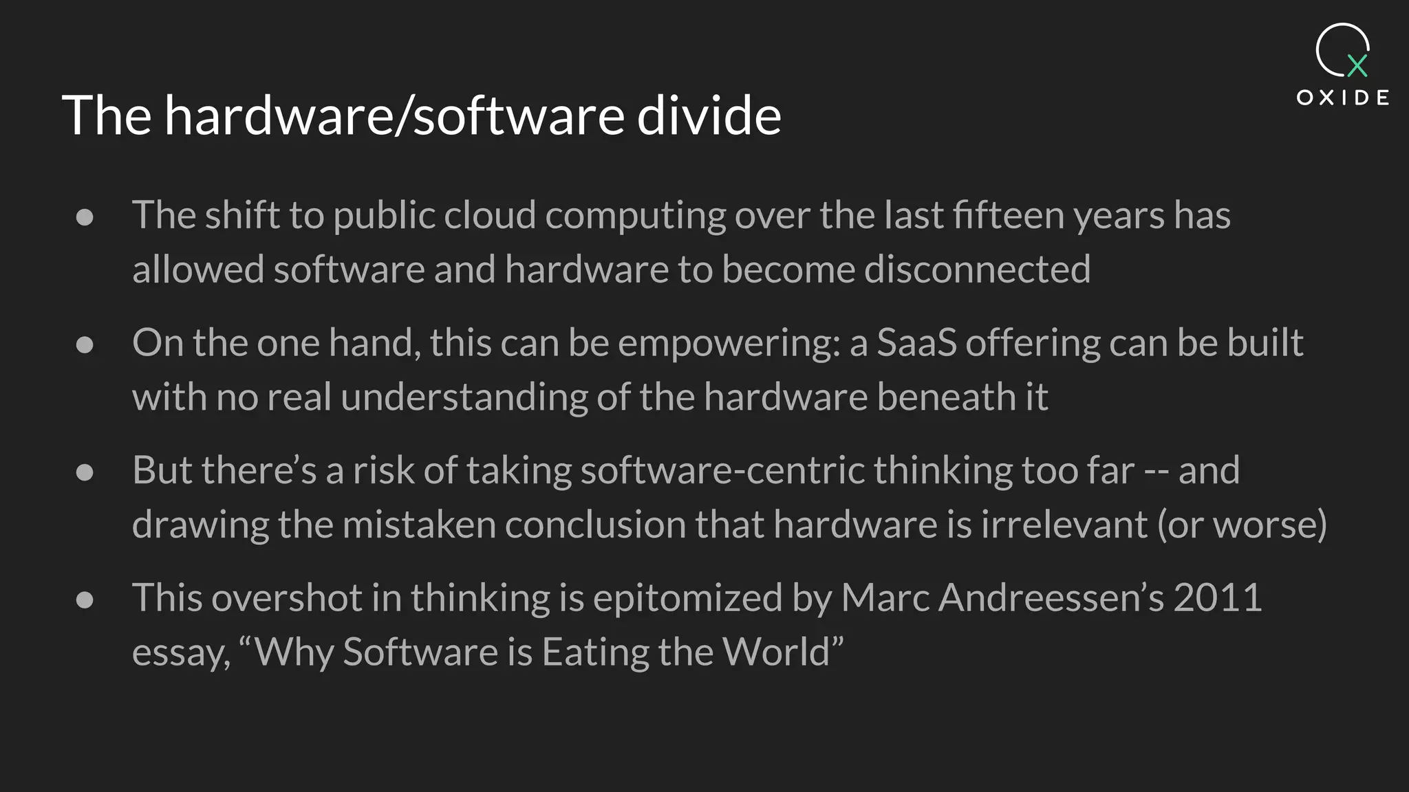 The document discusses the evolving landscape of hardware and software co-design, highlighting the risks of overly emphasizing software at the expense of hardware's relevance. It critiques Marc Andreessen's 2011 assertion that software dominates industries while acknowledging the slowing of Moore's Law and the potential of Wright's Law in predicting transistor costs. Furthermore, it emphasizes the importance of integrating open-source practices and flexible hardware designs in developing future computing systems.