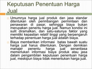 Dokumen ini membahas penggunaan informasi biaya penuh dalam penentuan harga jual produk dan jasa, menjelaskan bagaimana biaya berfungsi sebagai batas bawah harga jual serta memberikan perlindungan bagi perusahaan dari kerugian. Informasi biaya penuh membantu manajer memahami struktur biaya pesaing dan mendukung keputusan untuk memasuki pasar baru. Terdapat metode penentuan harga jual seperti normal pricing serta cost-plus pricing yang dijelaskan dengan contoh konkret untuk ilustrasi.