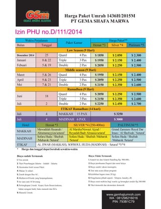 Dokumen ini menyediakan informasi tentang paket perjalanan umrah, termasuk harga dan jenis akomodasi sesuai dengan musim dan jumlah peserta. Paket tersebut mencakup visa, tiket penerbangan, akomodasi, dan makan, namun tidak mencakup biaya tambahan seperti pajak bandara dan pembuatan paspor. Harga dan tanggal dapat berubah sewaktu-waktu, dan ada daftar hotel yang termasuk dalam paket.