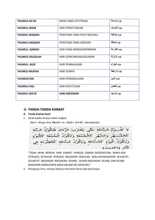 Dokumen ini membahas pengertian dan tanda-tanda hari akhir atau kiamat dalam Islam, termasuk kiamat kecil (kematian individu) dan kiamat besar (kehancuran semesta). Terdapat penjelasan tentang istilah-istilah yang berkaitan dengan hari kiamat dan berbagai tanda yang menunjukkan kedekatannya, baik yang kecil maupun yang besar. Juga dijelaskan fenomena sosial dan moral yang akan terjadi menjelang hari kiamat.