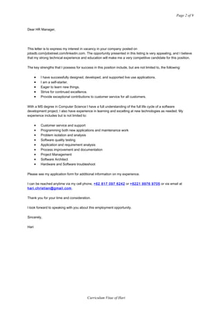 Hari is applying for a position posted on jobsdb.com. He has strong technical experience from various roles as a developer and project manager. His skills include programming, problem solving, software testing, and project management. He has a Master's degree in Computer Science and experience with technologies like Java, SQL, and software development processes.