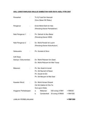 Dokumen ini merincikan pelaksanaan majlis sambutan Hari Guru pada 16 Mei 2007 di Dataran Perhimpunan Sekolah dengan 535 peserta. Program termasuk persembahan nyanyian, persembahan murid, dan penyampaian hadiah, serta jamuan ringan untuk guru. Anggaran perbelanjaan untuk majlis adalah RM1580.