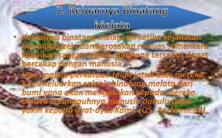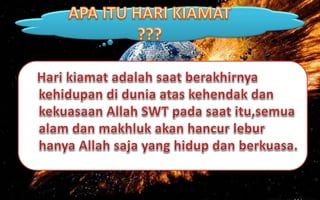 Dokumen tersebut membahas beberapa tanda-tanda kiamat besar seperti terbitnya matahari dari barat, munculnya kabut di akhir zaman, keluarnya Dajjal, dan bangkitnya Ya'juj dan Ma'juj. Dokumen ini juga menjelaskan bahwa hari kiamat pasti akan terjadi berdasarkan dalil-dalil Al-Quran meskipun waktunya hanya diketahui oleh Allah.