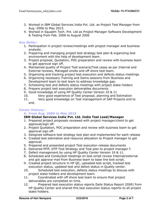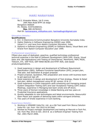 Hari Narayana is an experienced technology professional with over 15 years in software development and testing, specializing in Java, Oracle, and various SAP solutions. He has held roles including QA Test Lead and Project Manager across notable companies like VMware and IBM, focusing on test strategy, execution, and client interactions in projects related to global banking and insurance applications. His educational background includes a Bachelor of Engineering in Electronics and Communication, along with several diplomas in software engineering.