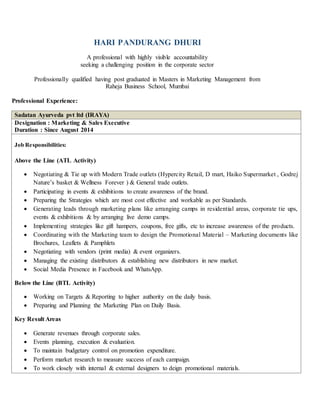 Hari Pandurang Dhuri has over 5 years of experience in marketing and sales. He holds a Masters in Marketing Management and has worked with companies like Sadatan Ayurveda and AMUL India. His experience includes negotiating with vendors and retailers, planning marketing strategies, market research, and social media marketing. He is skilled in business development, customer relationship management, and collaborating with teams to maximize revenue.