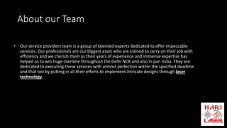 Hariom Laser is a leading provider of laser cutting and engraving services, featuring a skilled team dedicated to delivering high-quality results across a wide range of applications including fabric, leather, and paper. Their services encompass various specialized offerings such as curtain cutting, fashion designs, and intricate glass engravings, all executed with precision and expertise. The company prides itself on using advanced equipment to meet client requirements efficiently, contributing to its growing clientele in Delhi NCR and beyond.