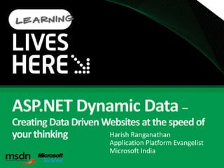 This document discusses Dynamic Data, an ASP.NET feature that provides scaffolding for quickly building data-driven websites. It presents an overview of Dynamic Data v1 and v2, comparing their capabilities for tighter integration with business rules and extensibility. The document also explores using Dynamic Data with the DomainDataSource to get the power of Dynamic Data with the control of a domain service, and how Dynamic Data can improve regular ASPX pages through centralized validation and templating.