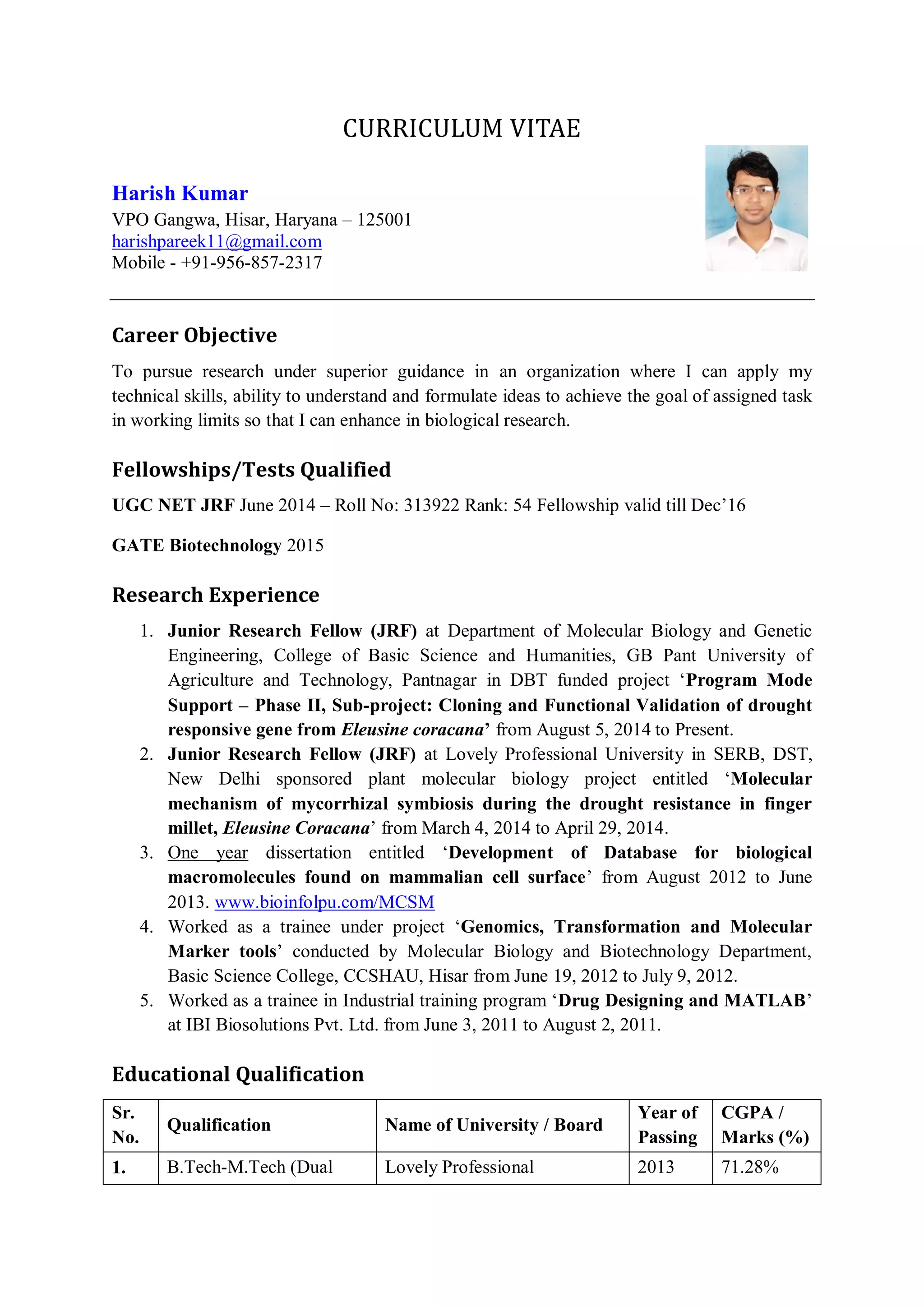 Harish Kumar is seeking a research position where he can apply his technical skills in biological research. He has a B.Tech-M.Tech in Biotechnology and is currently a Junior Research Fellow studying drought resistant genes in finger millet. His research experience also includes projects on molecular mechanisms of drought resistance and developing a database of mammalian cell surface macromolecules. He has strong skills in molecular biology techniques, plant tissue culture, bioinformatics, and computational skills like programming in C/C++ and MATLAB. He has published work on modeling and docking studies for Huntington's disease.