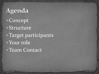 The document outlines details for an event called AVENUES 2009, including the concept, structure, target participants, roles, contacts, and agenda. It provides contact information for 3 people organizing the event and their roles. The event aims to bring together students interested in systematics to share ideas and knowledge.
