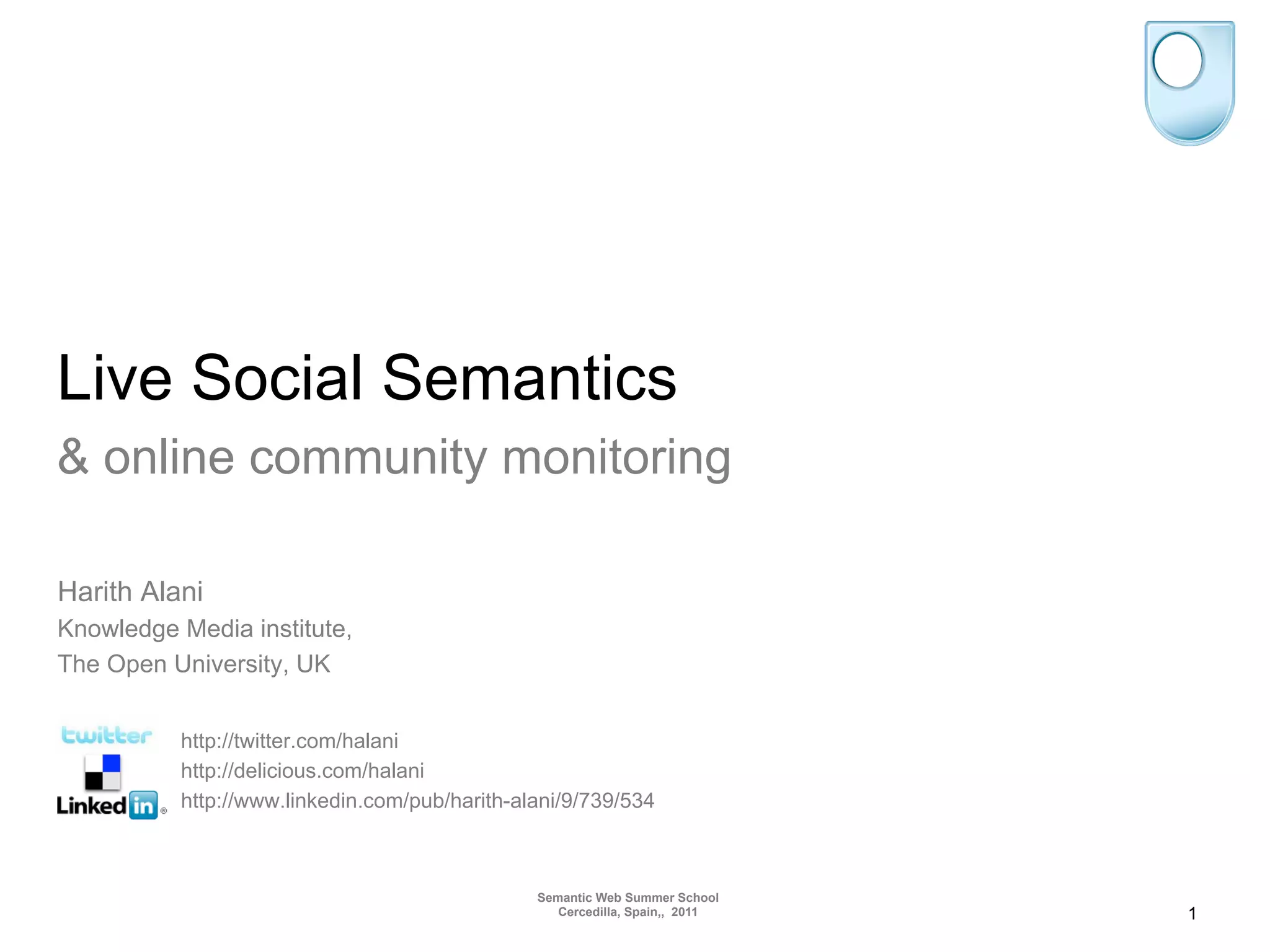 This document discusses live social semantics and monitoring online communities. It presents approaches to integrate physical presence data from RFID sensors with online social network and semantic web data. This would allow for semantic user profiling, logging face-to-face contacts, and analyzing how online and offline social networks converge. The live social semantics architecture extracts and links social media data to semantic web data sources and stores it in a triple store for analysis and applications like social network browsing.