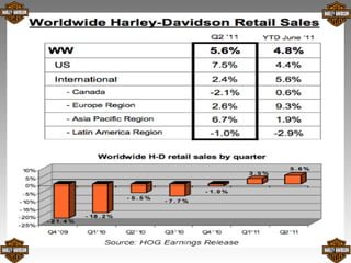 Harley Davidson is one of the largest motorcycle manufacturers known for its cruiser motorcycles. Founded in 1903, it has grown to sell motorcycles, apparel, accessories, and provide financing services. It has expanded globally with plants and dealerships worldwide. Harley Davidson focuses on continuous innovation, excellence in manufacturing, and fulfilling customers' dreams of freedom and adventure through motorcycling.