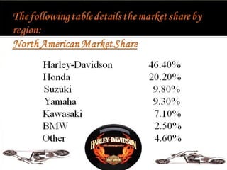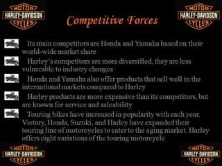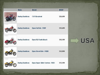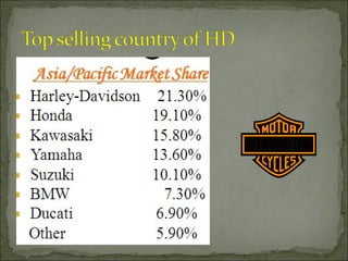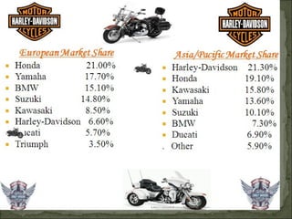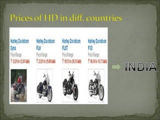 This document provides information about Harley-Davidson's sustainability strategy and plans to expand into the Indian motorcycle market. It discusses Harley-Davidson's goals of reducing waste and becoming zero landfill at its manufacturing facilities. It also outlines the company's plans to launch two smaller engine motorcycles, the Street 750 and Street 500, in India in 2014 at a lower estimated price of 4.5 lakhs rupees by manufacturing them locally using a high percentage of Indian-sourced parts. Finally, it notes that Harley-Davidson has had a CKD assembly unit in Bawal, Haryana since 2011.
