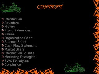 Harley-Davidson, founded in 1903 in Milwaukee, Wisconsin, is a leading motorcycle manufacturer and American icon, also producing various biking-related merchandise. The company has experienced significant historical milestones, including international expansion and the introduction of customized models for specific markets, such as India. Harley-Davidson maintains a strong market presence with a focus on brand loyalty through personalized experiences while facing challenges from competitors and market share constraints.