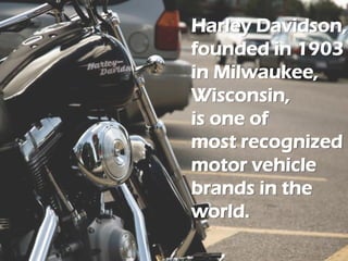 Harley-Davidson, established in 1903, benefits from strong brand loyalty through personalized customer relationships and community engagement, notably via its H.O.G program with over 1 million members. The company fosters a sense of individualism and adventure among riders, organizing events that enhance customer experience. Recommendations for attracting a younger audience include improving customer knowledge, focusing on tailored marketing strategies, and enhancing product quality to ensure long-term relationships.