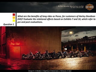 The document discusses the benefits of Harley-Davidson's Posse rides for customers. It finds that the rides provide social satisfaction from bonding with others who share interests, as well as opportunities to experience thrills and form memorials. However, customers felt the augmented product offerings were evaluated less positively and that they were not always heard. The document also evaluates whether the Harley Owners Group constitutes a community, finding that it is dynamic due to its varied structure and spontaneity. Finally, it argues that the Posse rides achieve Harley-Davidson's goals of fulfilling dreams and learning about customers, and that the company should continue the rides while improving their return on investment.