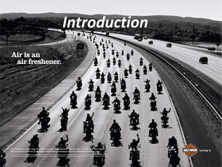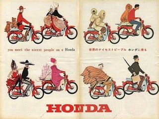 This document provides an overview of the history and business strategies of Harley-Davidson and Honda motorcycles. It describes how Harley-Davidson was the top American motorcycle manufacturer until Japanese companies like Honda entered the US market in the 1950s and 1960s. Honda's innovation and focus on quality allowed it to quickly gain a large market share. The document also discusses how Harley-Davidson struggled after being acquired by AMF in the 1960s but was able to regain success in the 1980s. Porter's Five Forces model is applied to analyze Harley-Davidson's competitive environment. Key aspects of Honda's history, expansion to the US, and strengths are summarized as well.
