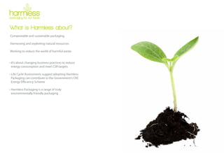 Harmless Packaging produces compostable and sustainable packaging materials that harness natural resources to reduce harmful waste. Their products include Harmless-Dissolve, a water soluble biodegradable polymer, Harmless-Compost, a starch-based packaging solution, Harmless-Bubble Bag, a compostable padded envelope, and Harmless-Wrap and Air, void filling and surface protection solutions to replace plastic. Harmless Packaging works to change business practices towards more sustainable options that meet environmental targets and reduce energy consumption and waste.