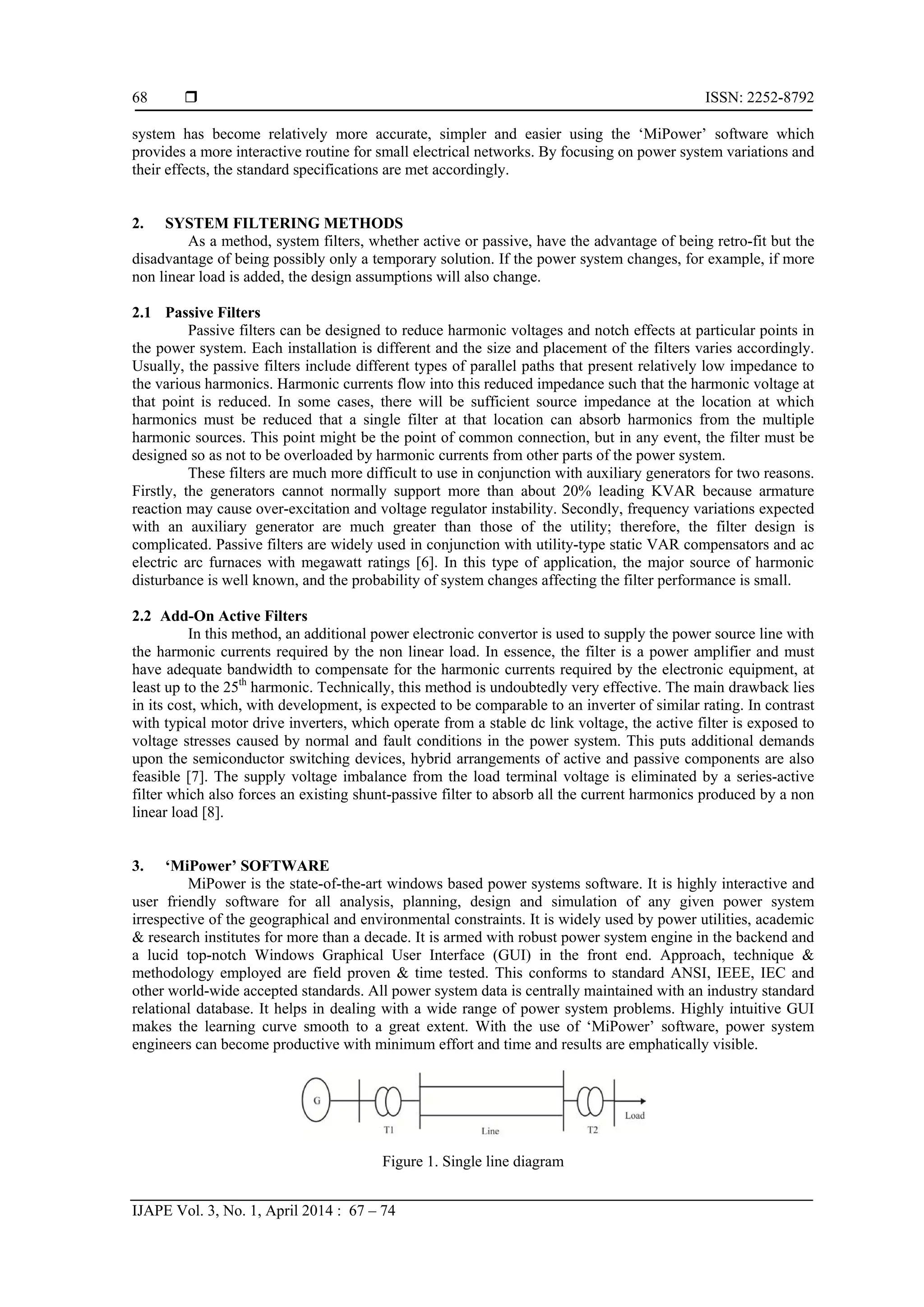 This document summarizes research on harmonic voltage distortions in power systems due to non-linear loads. It describes how non-linear loads can generate harmonics and discusses their effects. It also examines harmonic reduction methods like passive filters. The research uses MiPower software to model a sample IEEE 5-bus power system and analyze harmonic distortions with and without filters. Installation of single and dual passive filters at different buses is shown to significantly reduce total harmonic distortion throughout the system. The document concludes that accurate harmonic analysis of power systems can be achieved using such simulation tools.