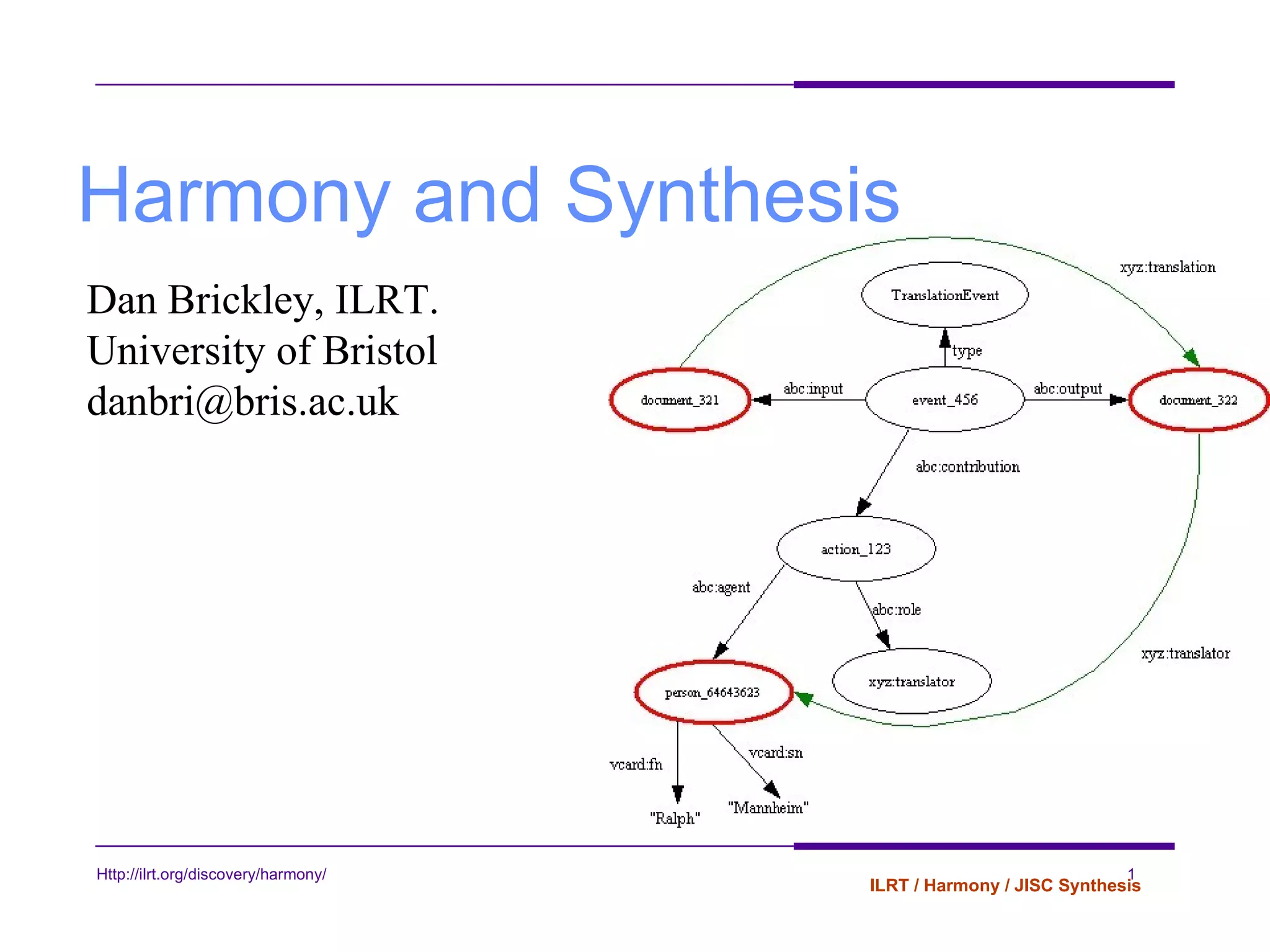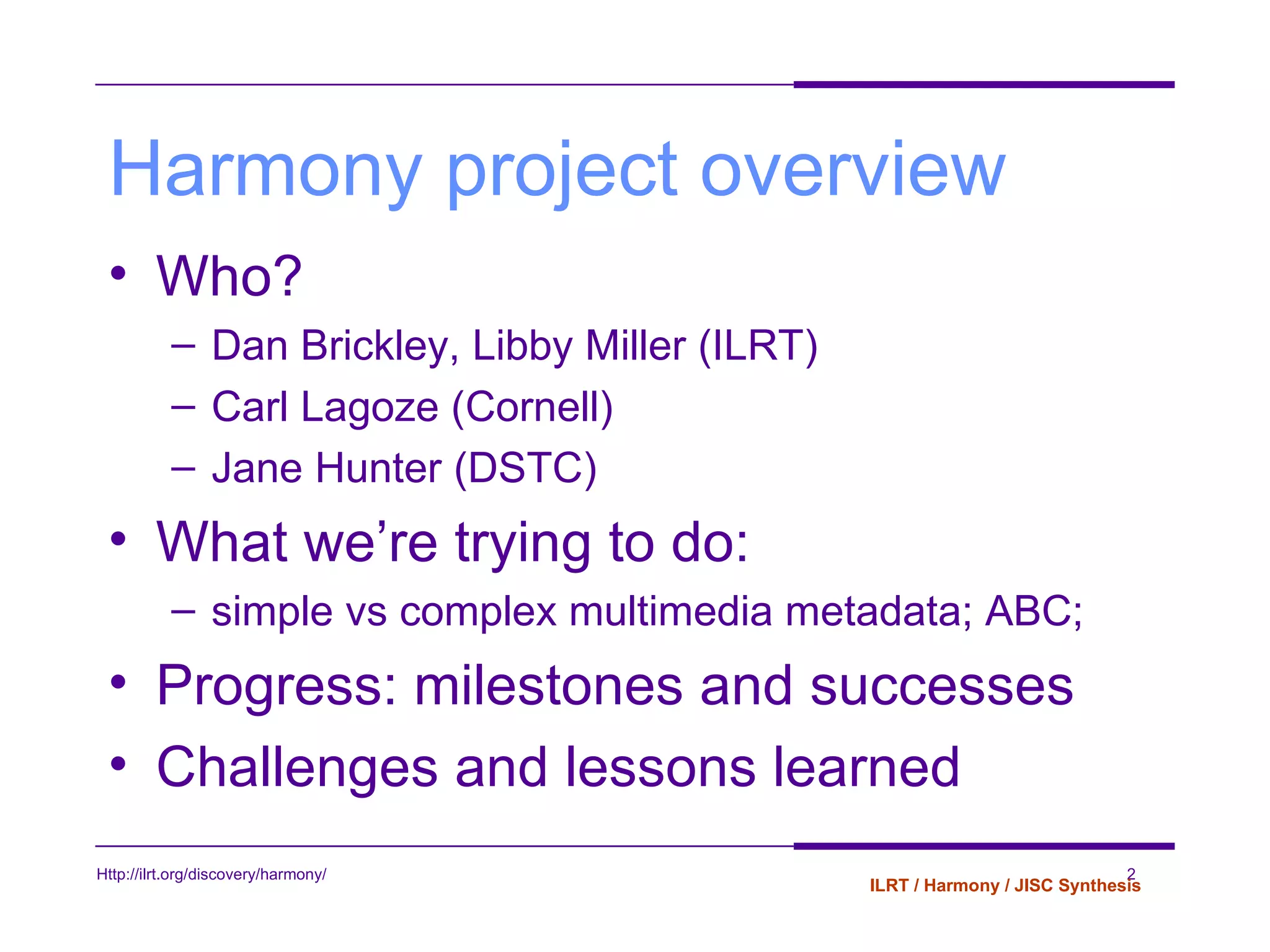 The Harmony collaboration led to a metadata model and query implementation that supports resource discovery over multimedia metadata descriptions. Key aspects include extending Dublin Core for multimedia, modeling complex cases like versioning and alternate formats, and proposing a common approach. The ABC model was implemented to address metadata challenges and allows querying across namespaces. Lessons learned include issues with project scope and coordination across distributed teams.