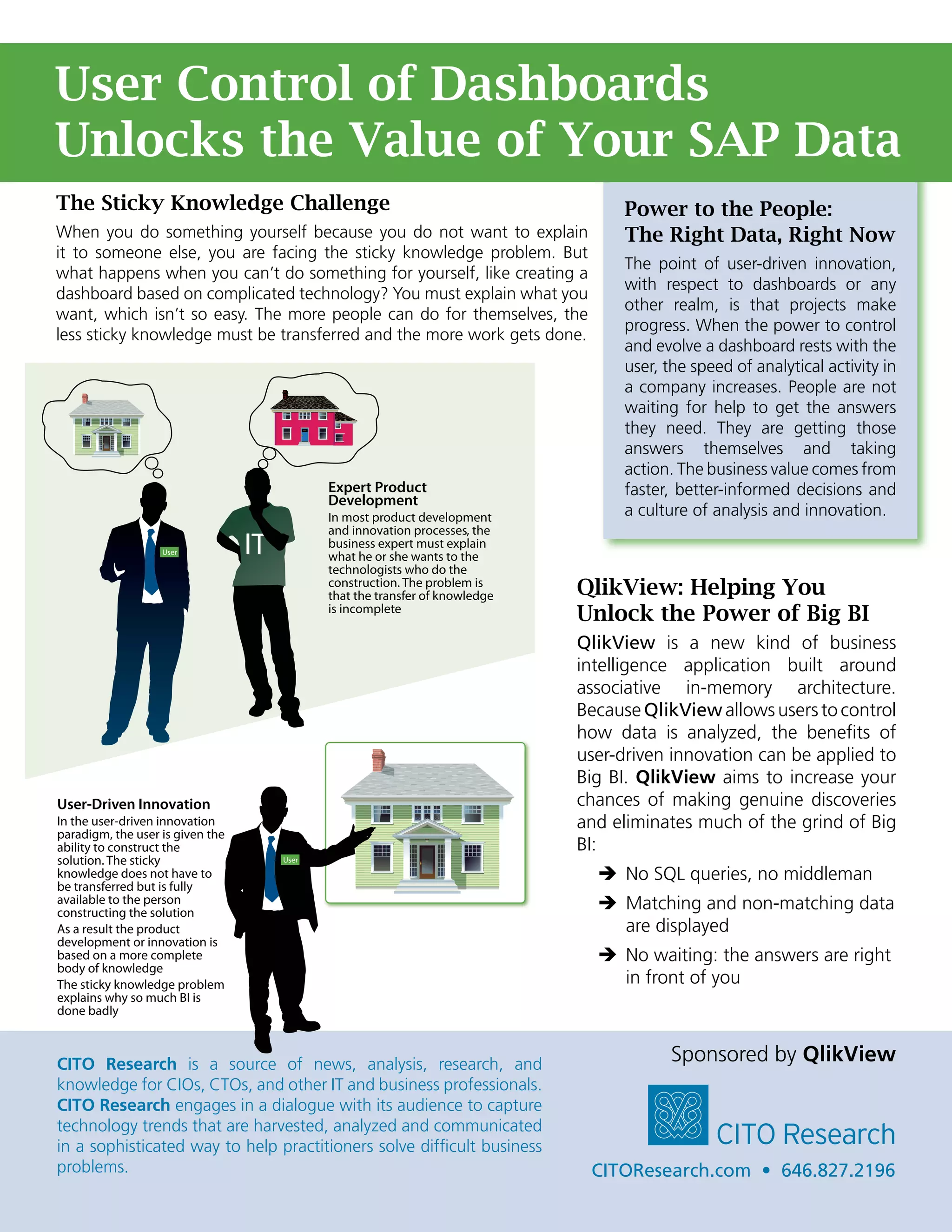 - QlikView is presented as a solution that allows users to directly control how data is analyzed through associative in-memory technology. This empowers users to more quickly generate insights, make decisions, and drive innovation without needing IT assistance.