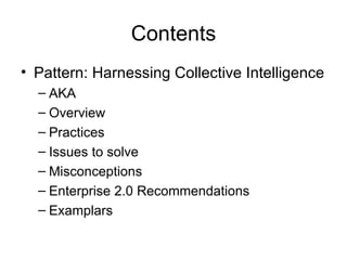 The document discusses principles and best practices for harnessing collective intelligence through Web 2.0 architectures. It describes how Web 2.0 is user-centered, decentralized, and collaborative. Two principles for successful participation architectures are that users add value directly through content or indirectly through their actions, and that network effects magnify this value. Harnessing collective intelligence provides benefits like rapid growth, trust-building, and improved products as the user base grows.