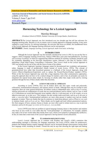 This article discusses how technology can be used to harness the Lexical Approach for language teaching. The Lexical Approach focuses on teaching language through lexical chunks rather than individual words. The article provides examples of how online games, collaborative writing tools, and video search tools can be used to create engaging activities centered around lexical chunks extracted from an example text. Specific websites like Edu Games, WordWall, Padlet and Yarn are discussed along with examples of activities like bingo, crosswords, matching games, and collaborative story writing that incorporate target lexical chunks from the text. The article argues that using technology allows the Lexical Approach to be easily implemented in modern language classrooms.