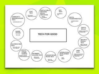 This document discusses how to harness technology for social good. It argues that technology can tackle social issues by giving more people agency, redistributing power, enabling connections, and democratizing data. It provides examples of innovative tech for good projects and discusses how non-profits can overcome barriers to innovation through experimentation, decentralizing power, testing ideas quickly, and questioning norms. Overall, the document advocates that under current conditions, technology provides opportunities to solve problems at scale through agile approaches focused on empowering people.