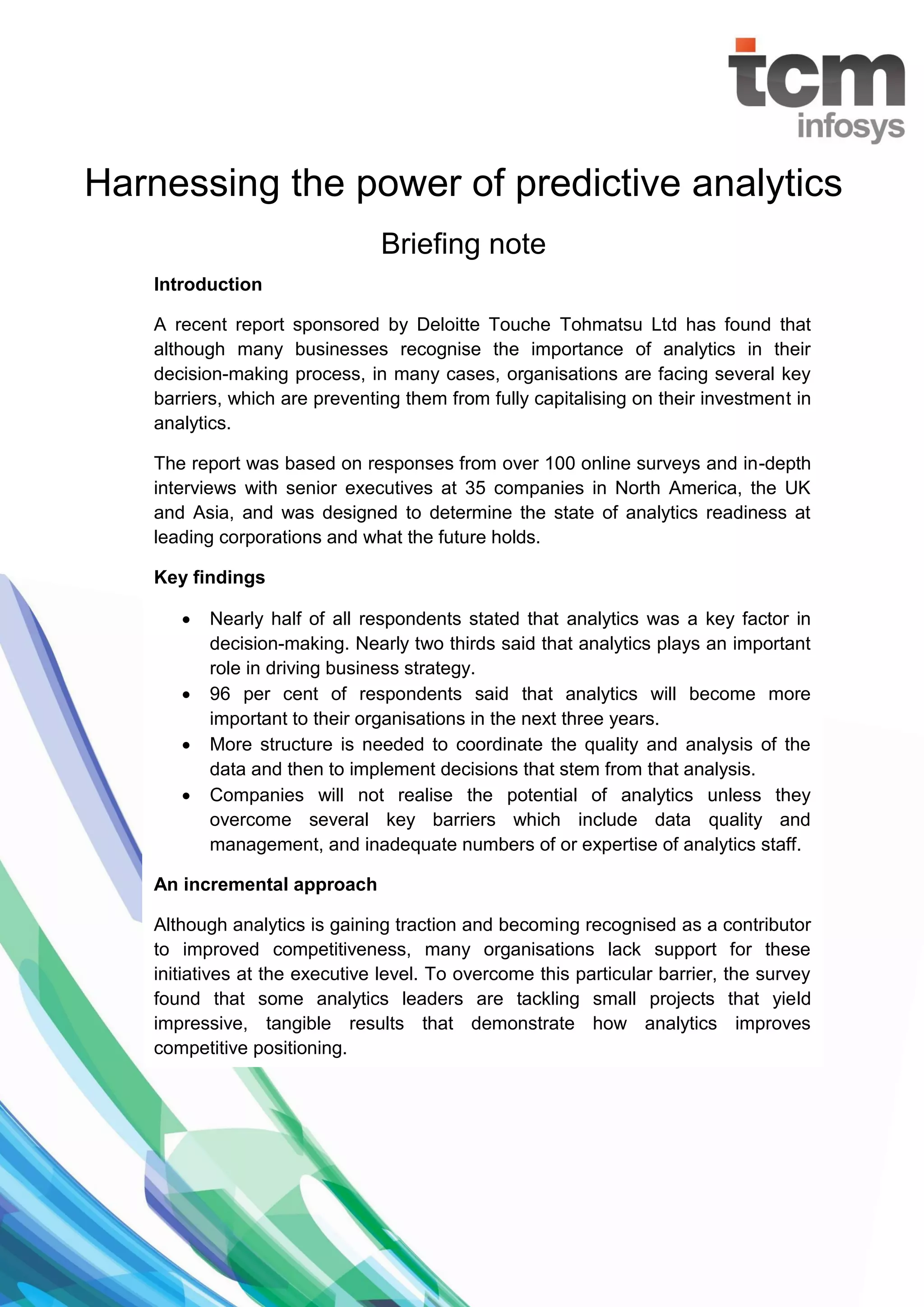 The document summarizes a report from Deloitte on the state of analytics in businesses. It finds that while many businesses recognize the importance of analytics, they face barriers like poor data management and a lack of analytics expertise. To overcome these barriers, the report recommends that companies start with small, impactful analytics projects to gain executive support. It also suggests that companies acquire needed expertise now, tie analytics to decision making, apply analytics to marketing and customers, create an analytics structure, and develop a long-term analytics strategy to fully realize the benefits of predictive analytics. With proper planning, organizations that evolve their use of analytics will have a competitive advantage in the future.