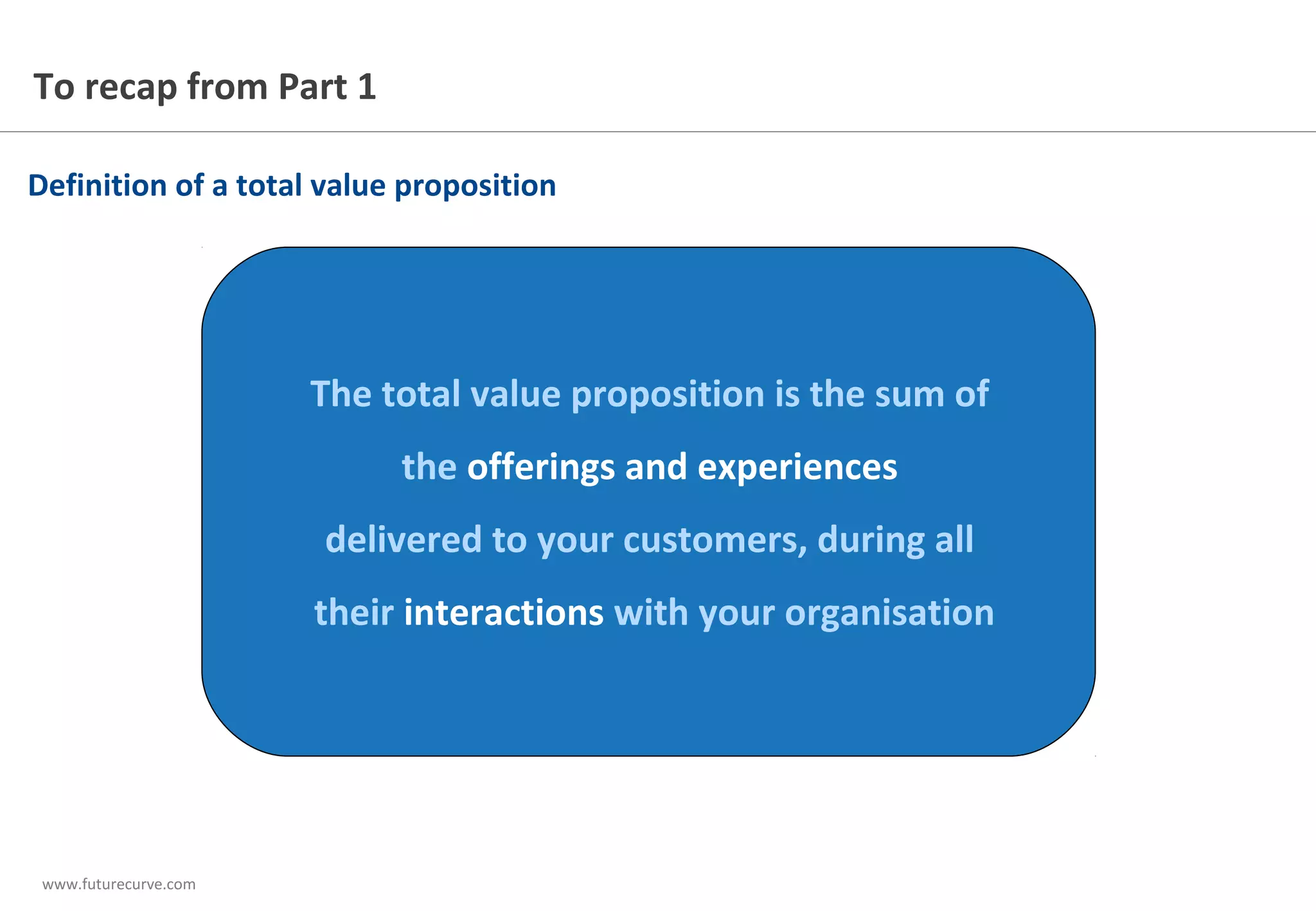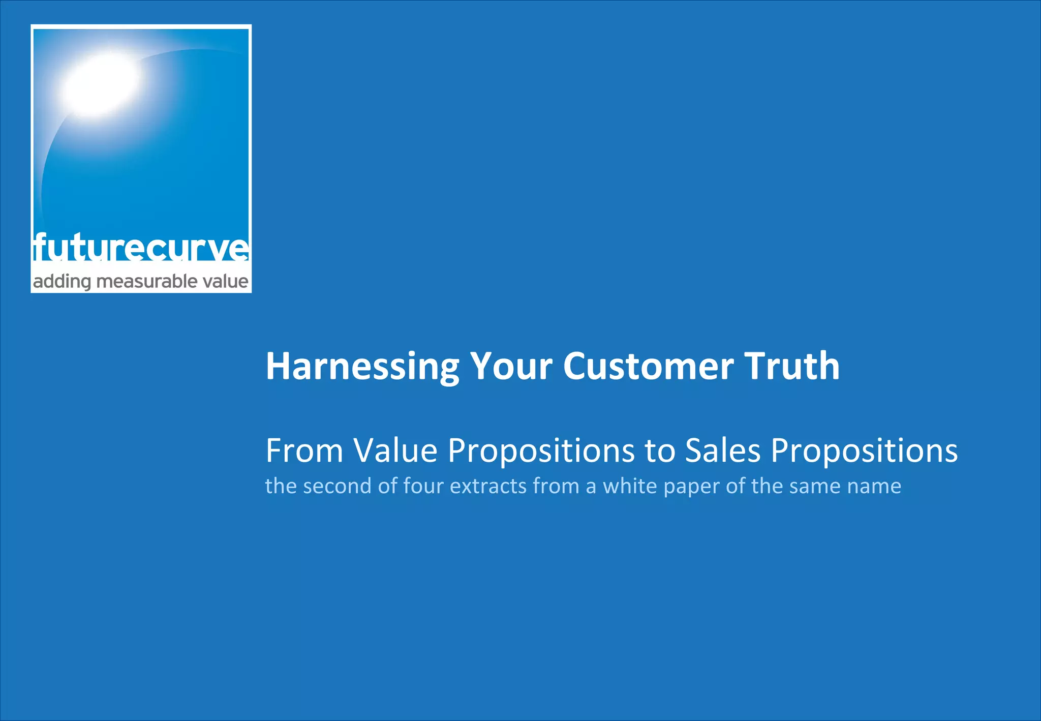 This document discusses the importance of developing a total value proposition that encompasses all aspects of customer interaction with a company. It emphasizes that sales propositions must align with this total value proposition, as disconnected messaging can lead to inefficiencies and lost revenue. Additionally, it highlights the need for incorporating customer feedback into the value proposition creation process to ensure relevance and effectiveness.