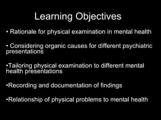 1. Physical examination is important in mental health assessment to identify any underlying organic causes for psychiatric presentations such as infections, metabolic disorders, endocrine abnormalities, and neurological conditions.