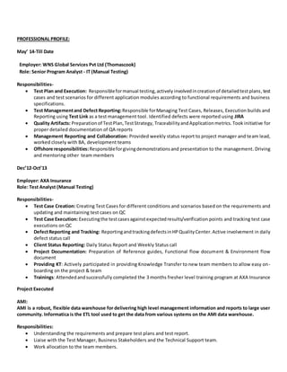 This document contains the resume of Harpreet Kaur Sehmby summarizing her professional experience and qualifications. She has over 3 years of experience as a Quality Assurance professional, currently working as a Senior Program Analyst at WNS Global Services. Previously, she worked as a Test Analyst at AXA Business Services. She has expertise in manual testing, test case design, test execution, and defect tracking using tools like HP Quality Center and JIRA. She holds a BCA degree from G.H. Raisoni College and is pursuing certifications in software testing and automation testing.