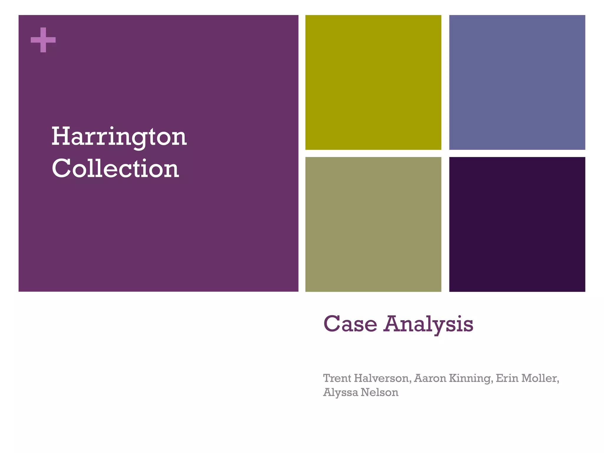 The document provides an analysis of the Harrington Collection company, which offers high-end fashion brands for women. It details the company's internal analysis including its target market, product lines, pricing strategy, promotion, and channels. It also analyzes the company's performance, external environment, competitors, and market segments. The case brief poses the problem of how to launch a new active wear line and evaluates two alternatives - offering "Better" pricing through current channels or "Moderate" pricing with expanded channels. It recommends the first option to maintain the brand's sophisticated image while achieving an 18% profit margin and breaking even in the first year.